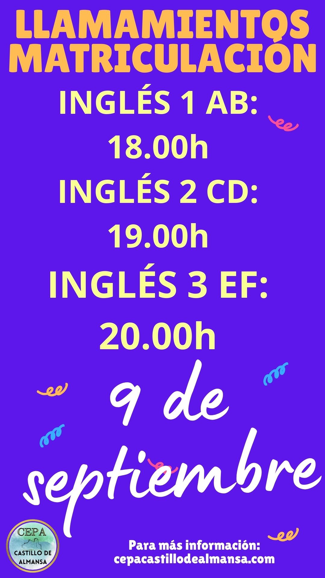- INGLÉS AB: Martes 9 de septiembre a las 18h