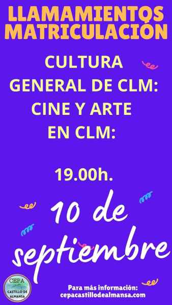 - CULTURA GENERAL DE CLM (ARTE Y CINE): Miércoles 10 de septiembre a las 19h.