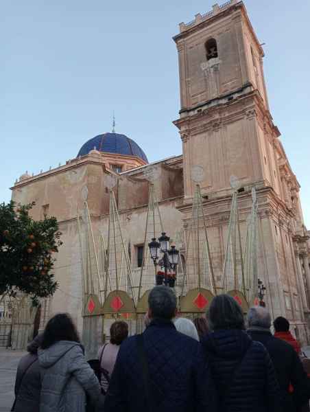 La siguiente visita condujo al grupo hasta la Basílica de Santa María, un espectacular templo barroco de los siglos XVII y XVIII. Su imponente fachada y su gran cúpula azul dominan el centro de la ciudad, y en su interior se alberga uno de los tesoros culturales más importantes de España: el Misteri d’Elx.