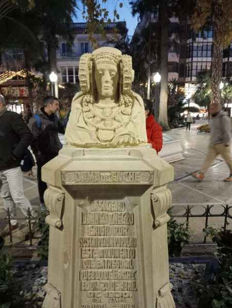 El recorrido continuó hacia el centro de la ciudad, donde se encuentra la réplica de la Dama de Elche. Esta reproducción permite observar de cerca el busto íbero más importante de España, descubierto en 1897 en el yacimiento de La Alcudia.