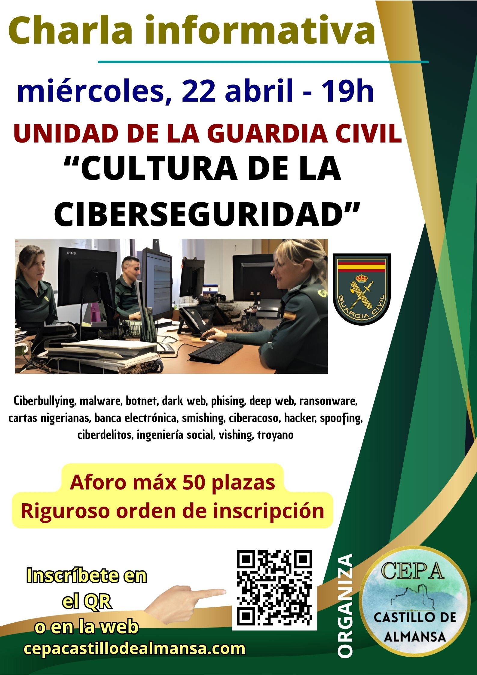La sección de ciberdelincuencia de la Guardia Civil imparte la charla "CULTURA DE LA CIBERSEGURIDAD" el próximo miércoles 22 de abril.