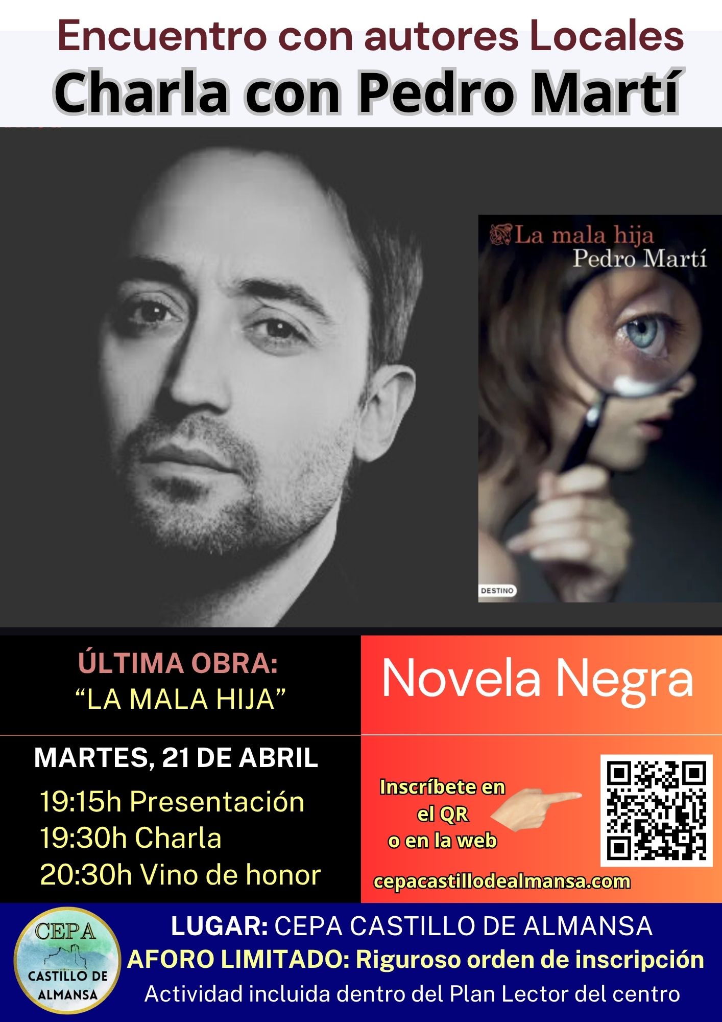 El CEPA Castillo de Almansa dentro del Plan de Lectura de Centro organiza la actividad denominada "Encuentro con autores locales" con el escritor local Pedro Martí, creador del libro "LA MALA HIJA" ambientado en Almansa. El evento consistirá en una charla-coloquio sobre su novela escrita en el género novela negra.