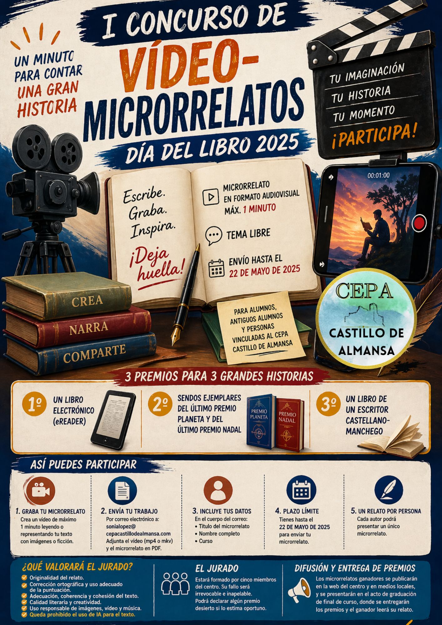 El CEPA Castillo de Almansa organiza y convoca el I Concurso de VIDEO - MICRORRELATOS con motivo de la semana del libro, que se regirá por las siguientes bases: