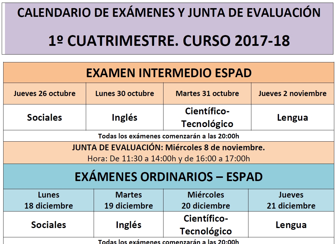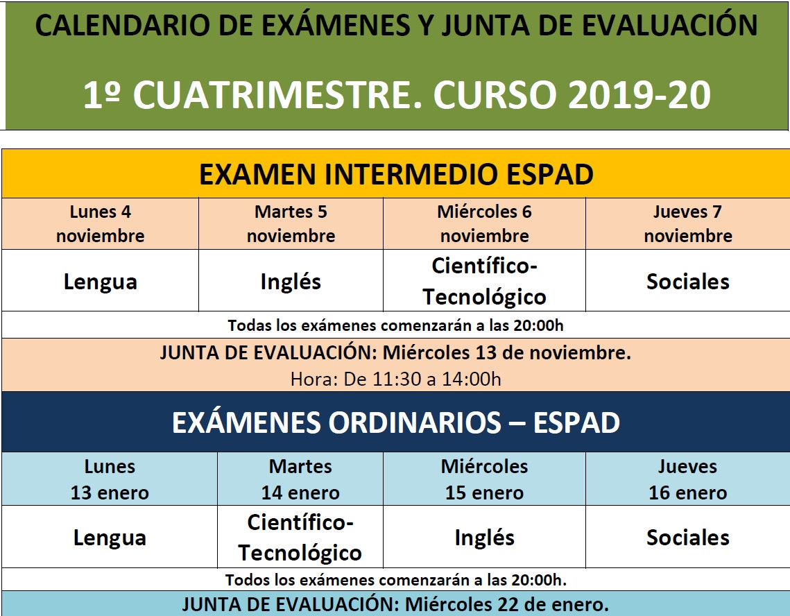 Ya están publicadas las fechas de los exámenes ordinarios y extraordinarios del 1º cuatrimestre de los alumnos de ESPAD de ALMANSA. Alumnos que vienen en el horario de tarde.