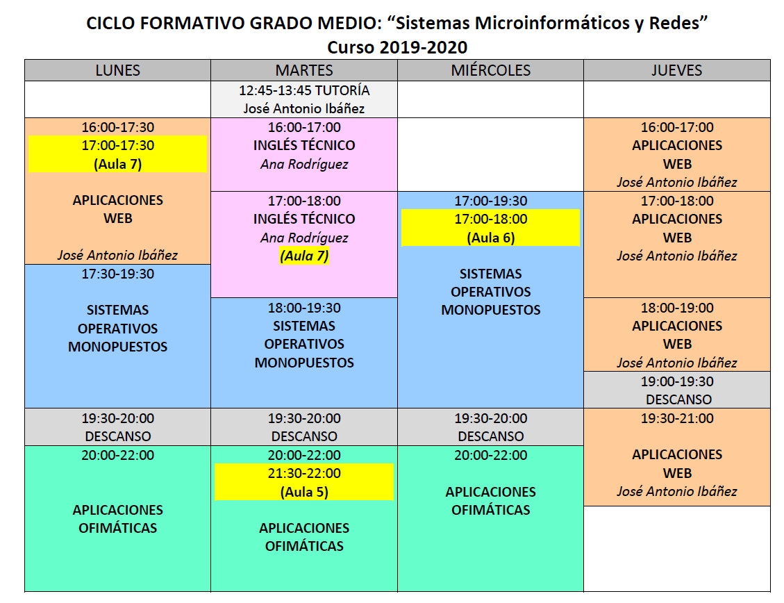 Os adjuntamos el horario del Ciclo Formativo de Grado Medio "Sistemas Microinformáticos y Redes".