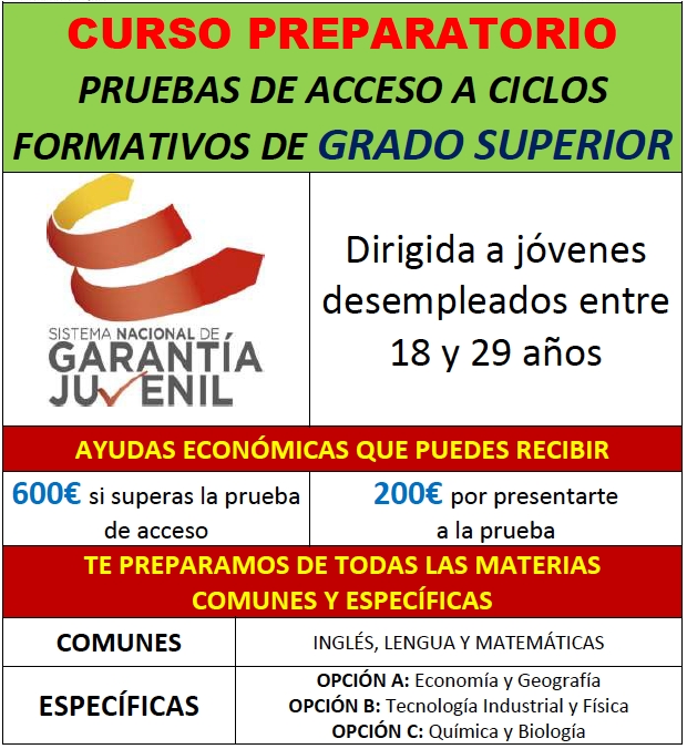 ABIERTO PLAZO DE ADMISIÓN AL "CURSO PREPARATORIO ACCESO A GRADO SUPERIOR" - PROGRAMA DE GARANTÍA JUVENIL - IMPORTANTES AYUDAS ECONÓMICAS