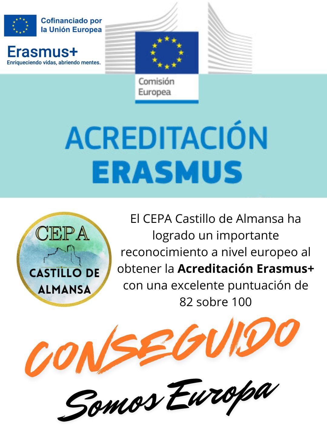 La Acreditación Erasmus+ es un distintivo otorgado por la Unión Europea a aquellas instituciones educativas que demuestran una estrategia sólida de internacionalización, inclusión y modernización de sus prácticas educativas. Gracias a esta acreditación, el CEPA Castillo de Almansa podrá participar de forma estable en el programa Erasmus+ durante los próximos años, facilitando la movilidad de profesorado y alumnado a otros países europeos.