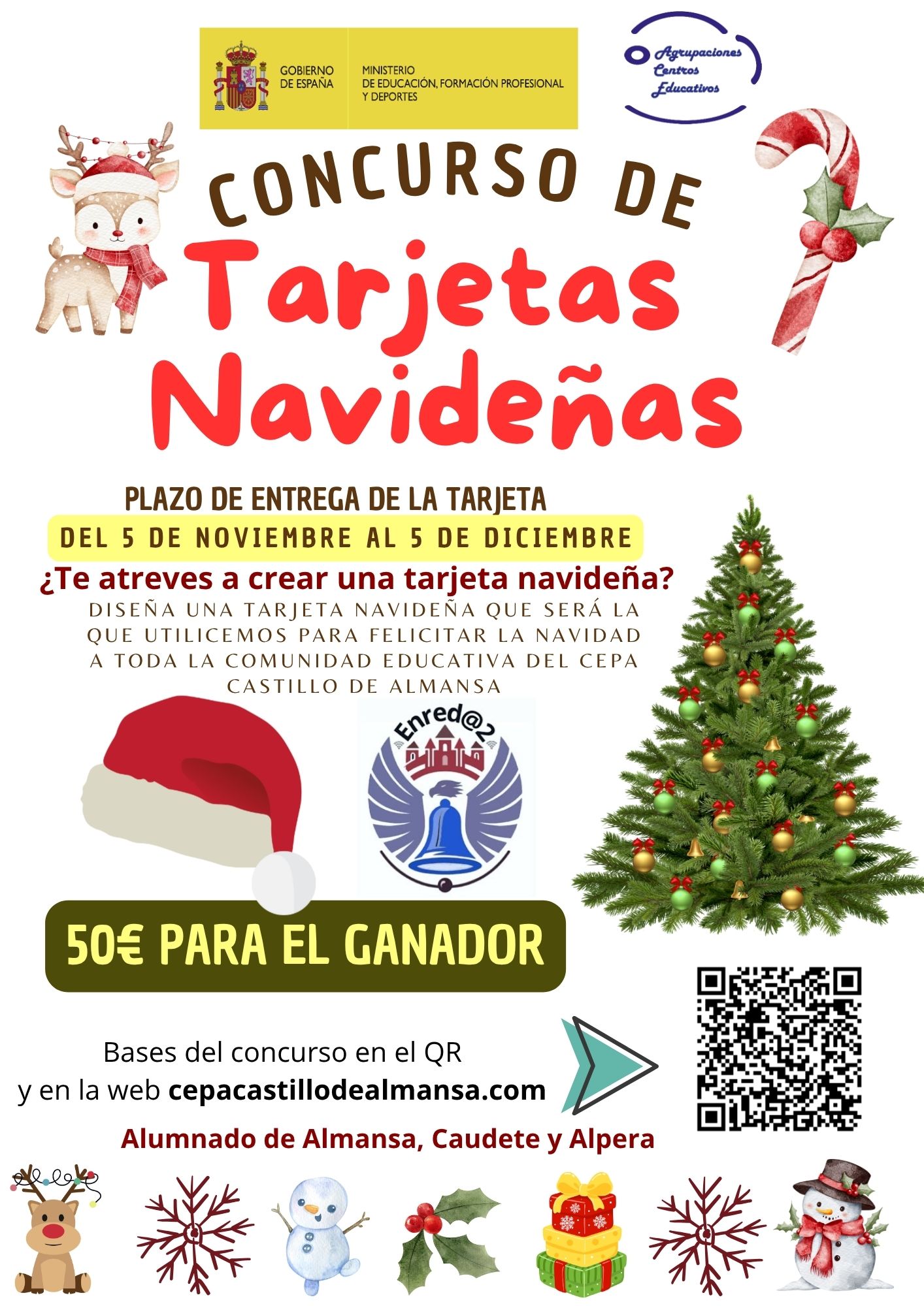 El CEPA Castillo de Almansa organiza y convoca el concurso de tarjetas navideñas para felicitar las navidades a toda nuestra comunidad educativa, este concurso está enmarcado dentro del proyecto ENRED@2 que realizamos conjuntamente con el CEPA PISUERGA de Aguilar de Campoo y el CFA SANT BOI de Llobregat que se regirá por las siguientes bases: