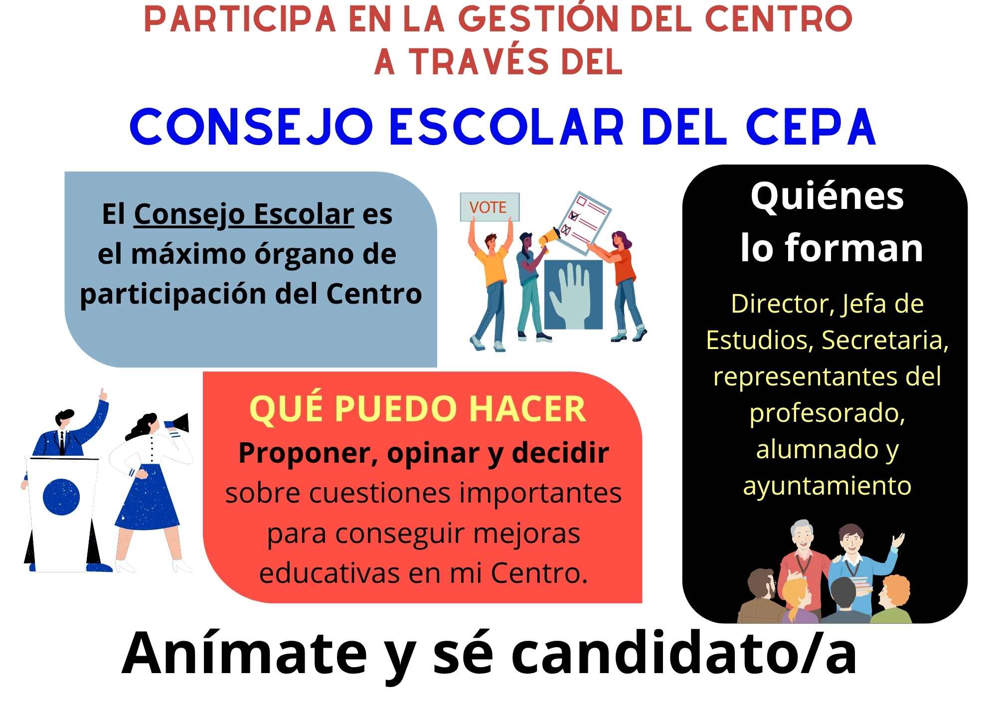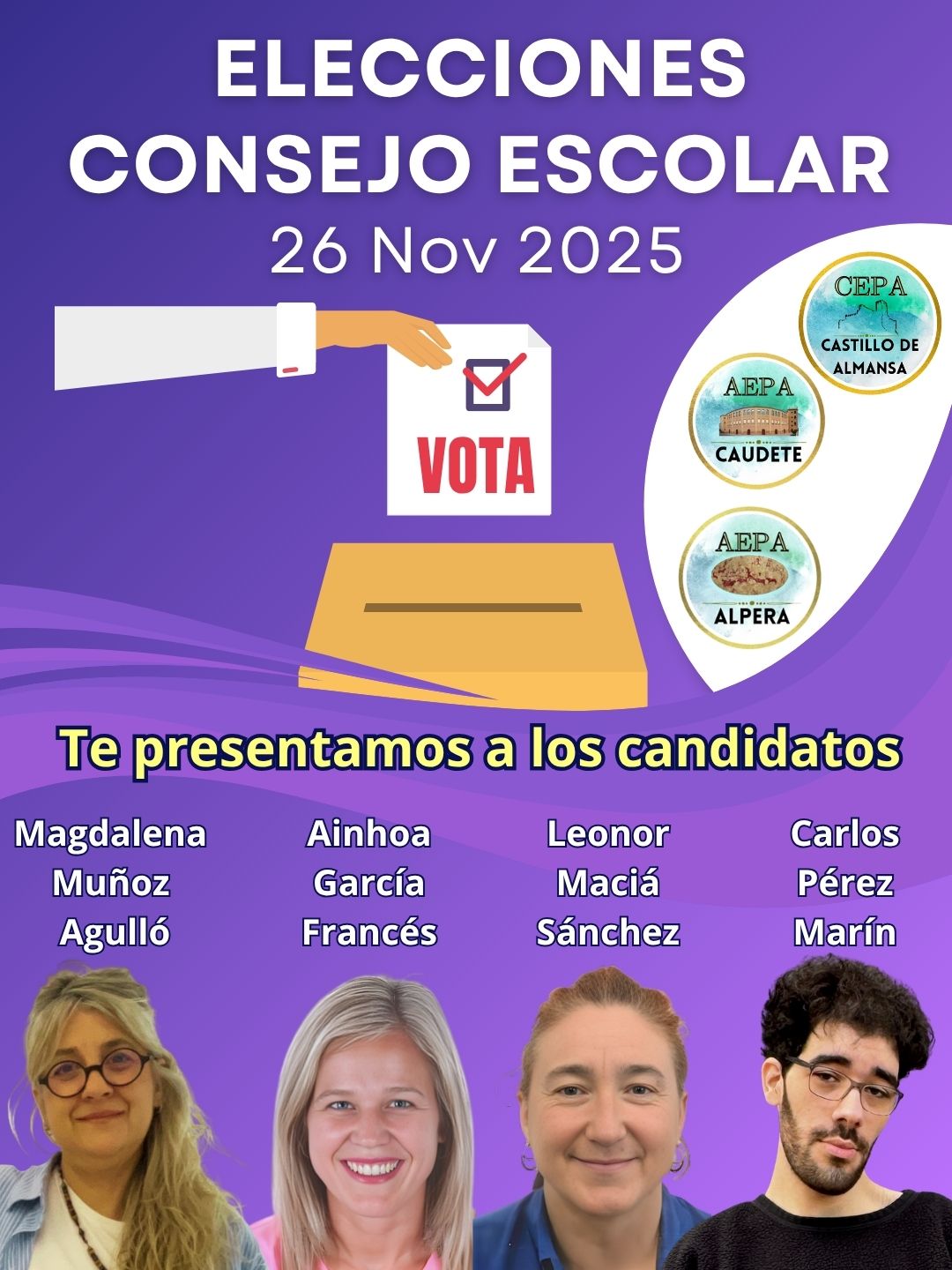 El próximo miércoles, 26 de noviembre se realizarán las votaciones del sector del alumnado para formar parte del Consejo Escolar del Centro, existe una vacante y tenemos cuatro candidaturas. Es fundamental que todo el alumnado del CEPA y AEPAs vote ese día.
