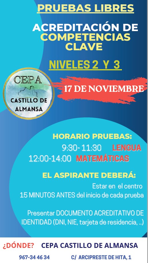 El próximo lunes, 17 de noviembre, se celebrarán en el CEPA CASTILLO DE ALMANSA las pruebas de acreditación de las competencias clave N2 y N3.