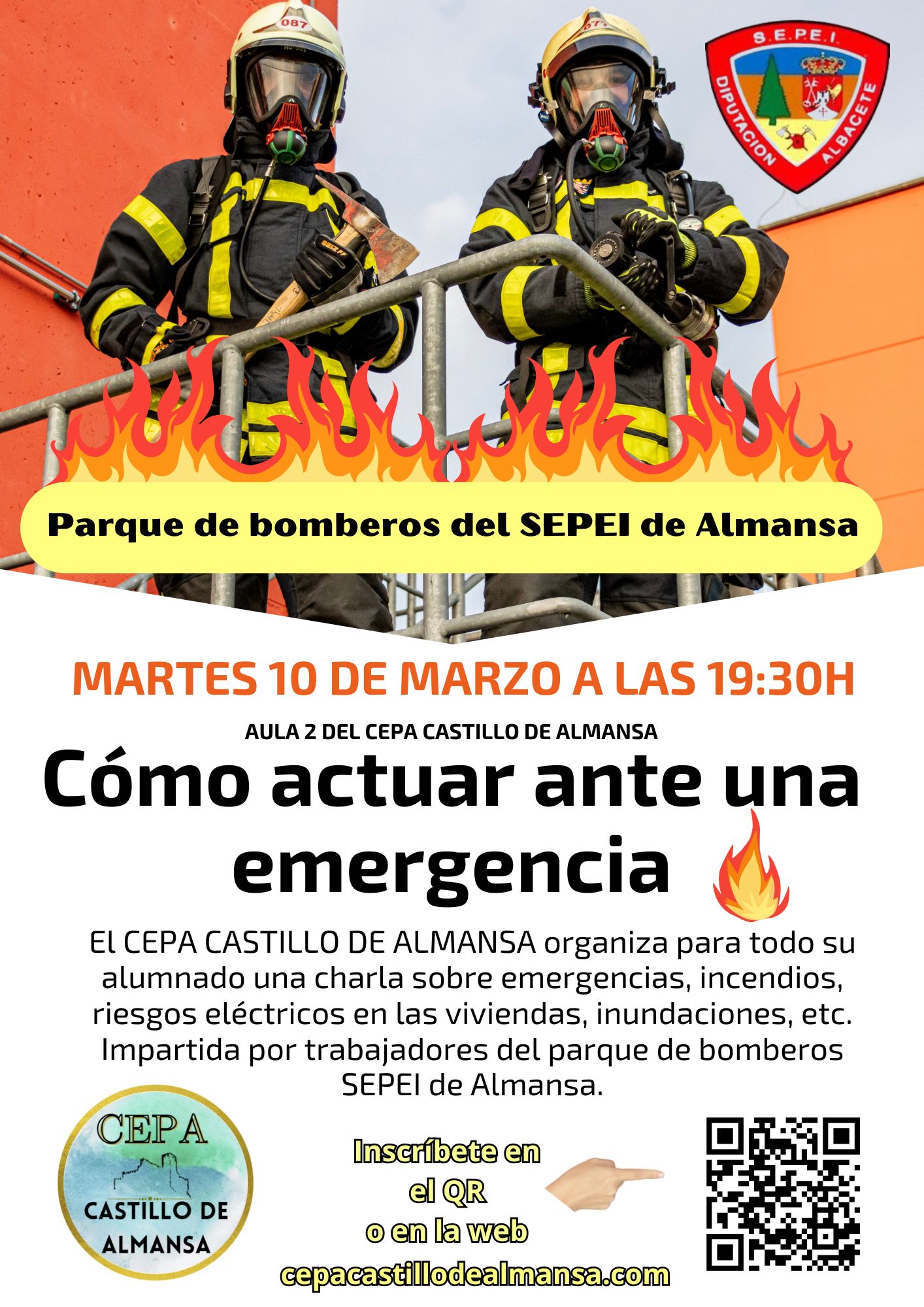 El CEPA CASTILLO DE ALMANSA organiza para todo su alumnado una charla sobre emergencias, incendios, riesgos eléctricos en las viviendas, inundaciones, etc. Será impartida por profesionales del parque de bomberos SEPEI de Almansa, que compartirán su experiencia real y consejos prácticos para saber cómo reaccionar ante cualquier imprevisto.