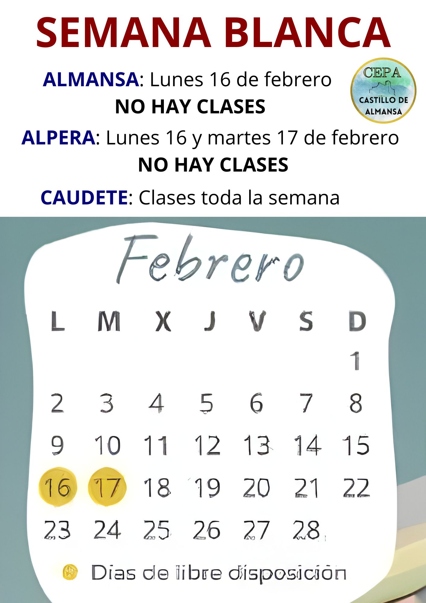 Te informamos de que la semana que viene empezamos el curso en las tres aulas de Almansa, Caudete y Alpera. Los horarios son los siguientes: