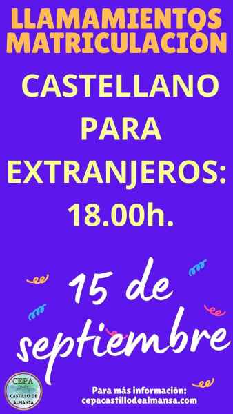 Debéis acudir al CEPA CASTILLO DE ALMANSA en el horario indicado. Os iremos llamando en función de la adjudicación definitiva de puestos escolares de vuestras enseñanzas para que escojáis horario.