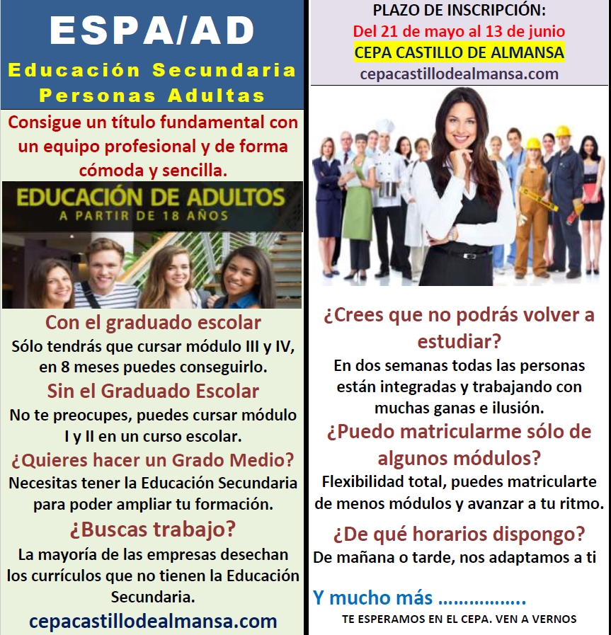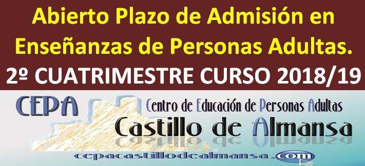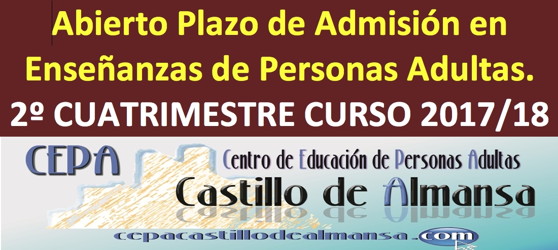 El CEPA CASTILLO DE ALMANSA informa del periodo extraordinario de admisión para el 2º Cuatrimestre en Educación Secundaria de Adultos.