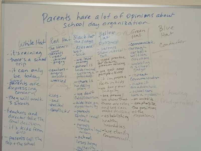 Tras el momento lúdico y el coffee break, nos pusimos a trabajar de nuevo con una técnica que no conocíamos, aplicable en el centro educativo: Seis sombreros para pensar creada por Edward de Bono. Es una herramienta para la toma de decisiones y la resolución de conflictos basada en el uso de seis sombreros de diferentes colores, cada uno representando un estilo de pensamiento. Ante un problema concreto, debemos ponernos l os siguientes sombreros en este orden: