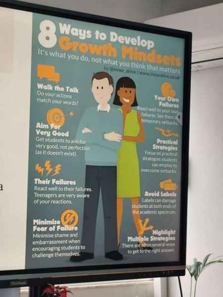 A continuación Leila (la profesora), expuso los 8 caminos para desarrollar una mentalidad de crecimiento 1- Caminar por hablar, 2- apuntar hacia lo bueno, 3- los fracasos te hacen crecer, 4- minimizar el miedo al fracaso, 5- aprender de tus propios fracasos, 6- Hacer estrategias prácticas, 7- evite las etiquetas y 8- destacar estrategias múltiples.