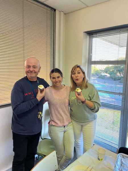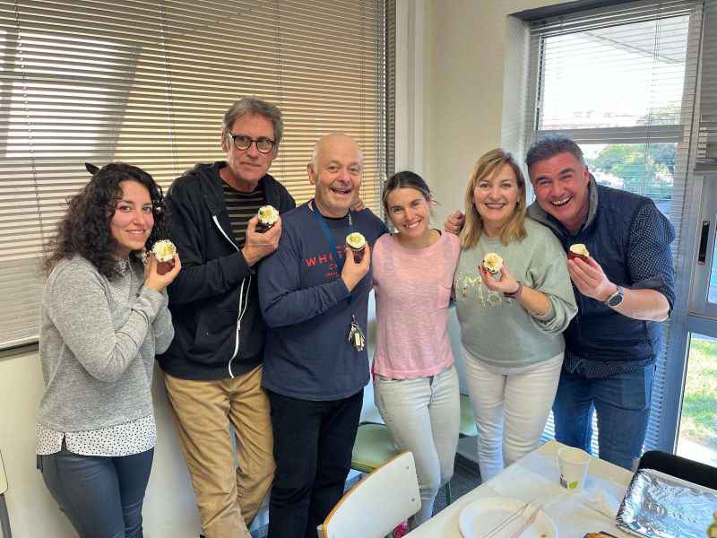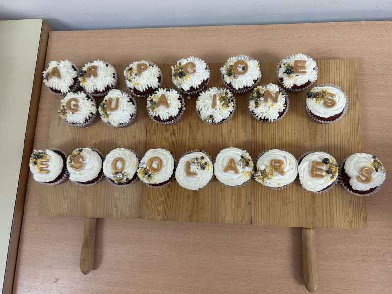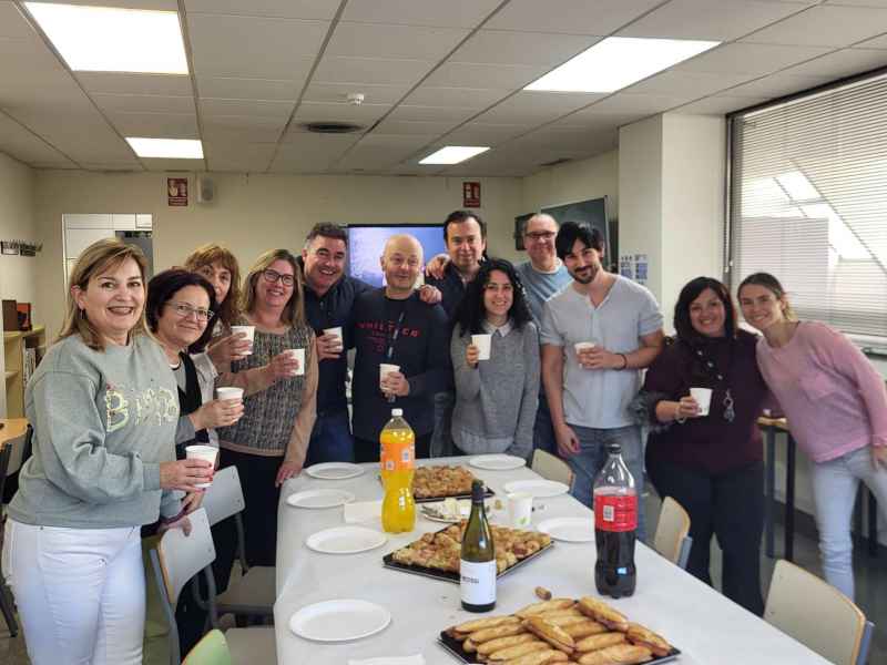 Al finalizar el trabajo cooperativo nos prepararon una comida con profesorado y alumnado seleccionado en el proyecto del CFA Sant Boi. Pudimos compartir experiencias educativas con los miembros de la comunidad educativa de este centro. Nuestra compañera y coordinadora del proyecto, Berta, nos sorprendió y deleitó con unas Moffis de elaboración casera decoradas con el texto “Agrupaciones Escolares” y estaban bueniiiiiiísimas, gracias Berta.