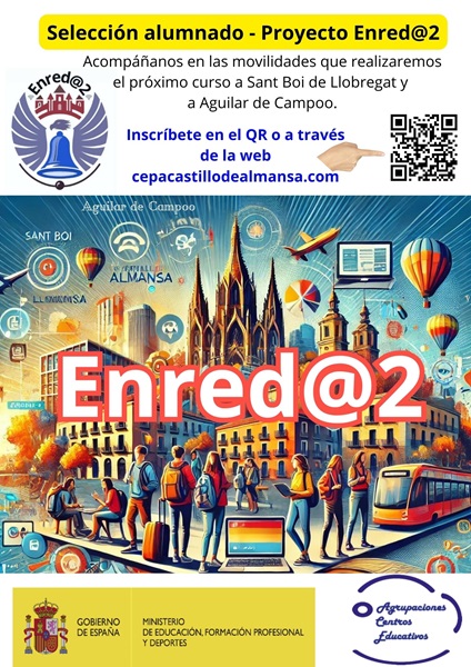 El proyecto Enred@2 lo forman el CFA SANT BOI de Llobregat, el CEPA PISUERGA de Aguilar de Campoo y el CEPA CASTILLO DE ALMANSA. Consiste en compartir experiencias tecnológicas y actividades de aprendizaje. Vamos a realizar movilidades entre los tres centros de profesorado y alumnado en torno a la alfabetización digital. Durante este primer año será el profesorado quien realice las movilidades para planificar las posibles actividades a realizar al año siguiente con el alumnado seleccionado.
