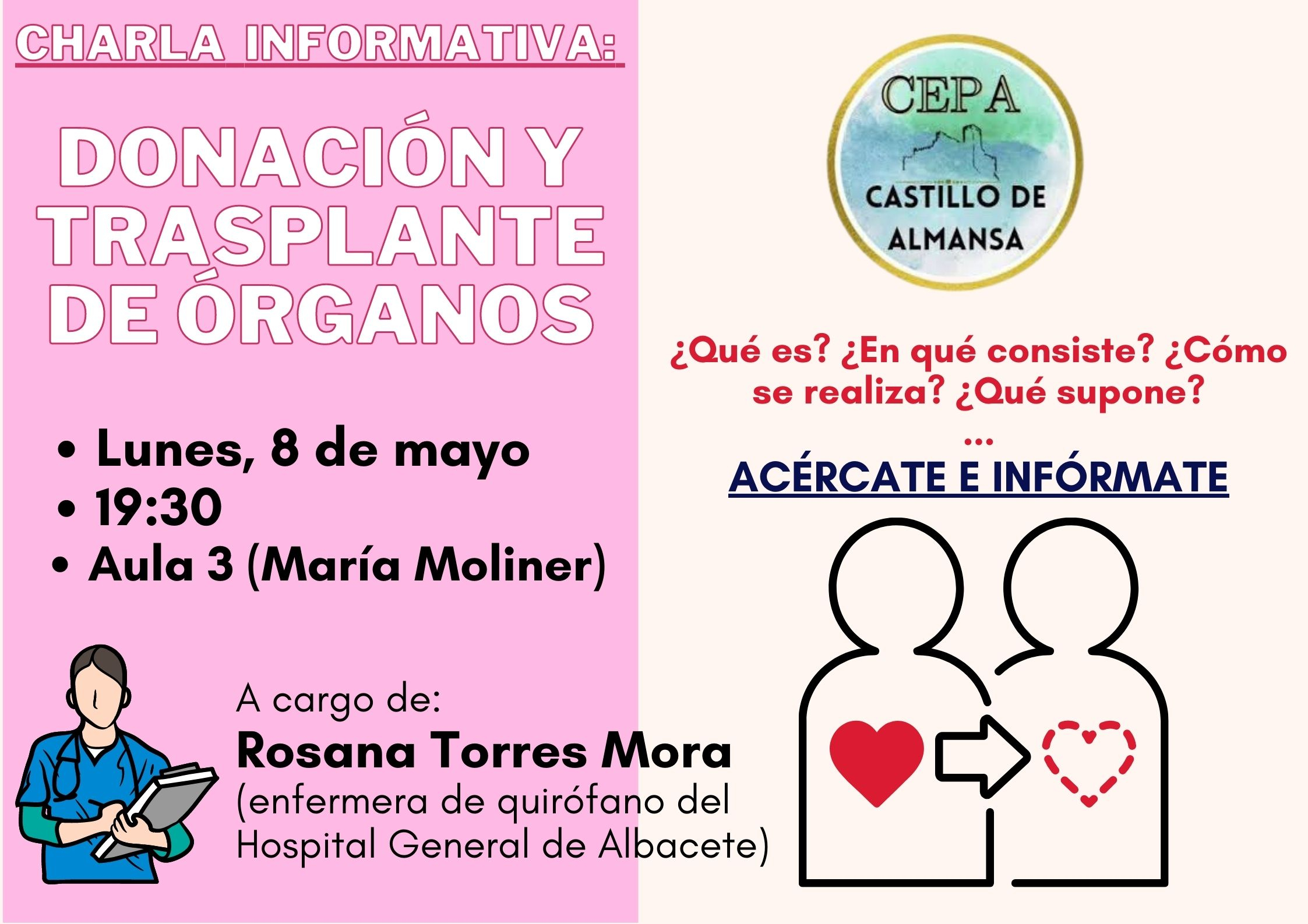 El CEPA Castillo de Almansa organiza una charla informativa sobre la Donación y Trasplante de órganos. "¿Qué es?, ¿En qué consiste?, ¿Cómo se realiza?, ¿Qué supones?"