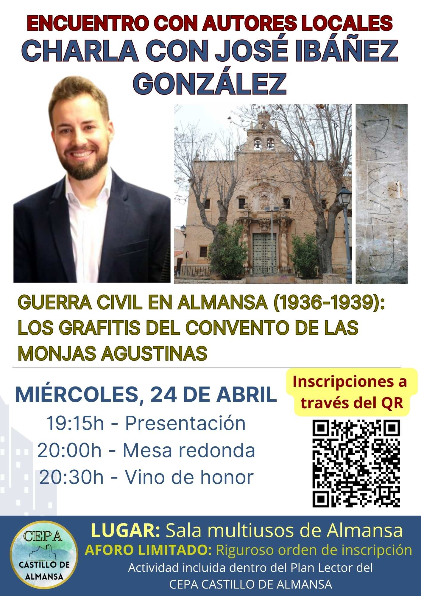 El CEPA Castillo de Almansa dentro del Plan de Lectura de Centro organiza la actividad denominada "Encuentro con autores locales" con el autor local José Ibáñez González, creador del libro "GUERRA CIVIL EN ALMANSA (1936-1939): LOS GRAFITIS DEL CONVENTO DE LAS MONJAS AGUSTINAS". El evento consistirá en una charla-coloquio sobre este tema tan interesante para la ciudadanía almanseña.