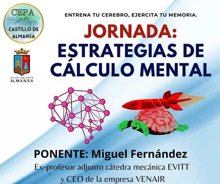 El CEPA Castillo de Almansa informa de que hemos abierto el periodo de inscripción en una Jornada gratuita sobre Cálculo Mental impartida por Miguel Fernández, ex-profesor adjunto cátedra mecánica EVITT y CEO de la empresa afincada en Almansa VENAIR.