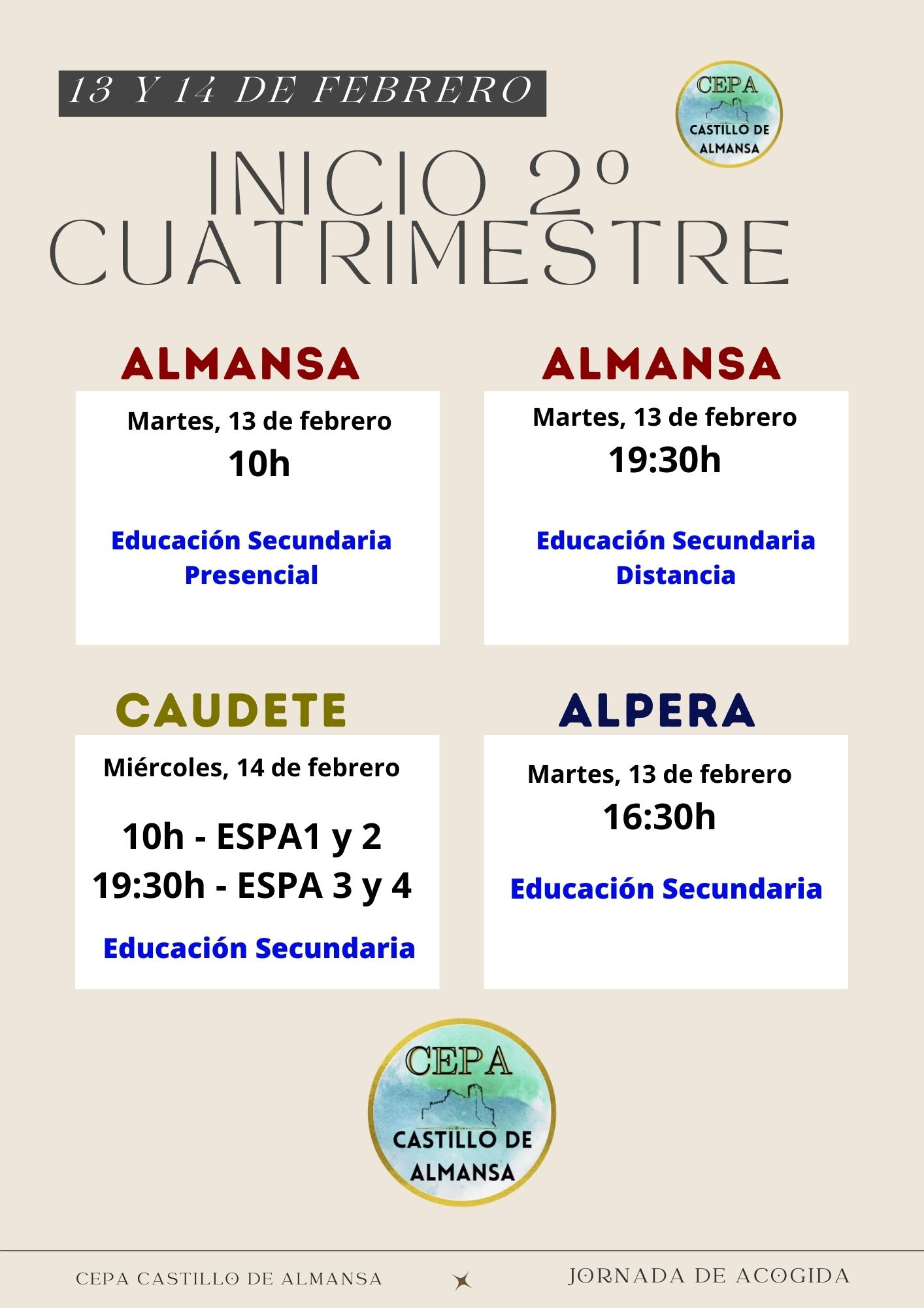 El CEPA CASTILLO DE ALMANSA iniciará sus clases de Educación Secundaria correspondientes al 2º Cuatrimestre el próximo 13 y 14 de febrero, debéis tener en cuenta: