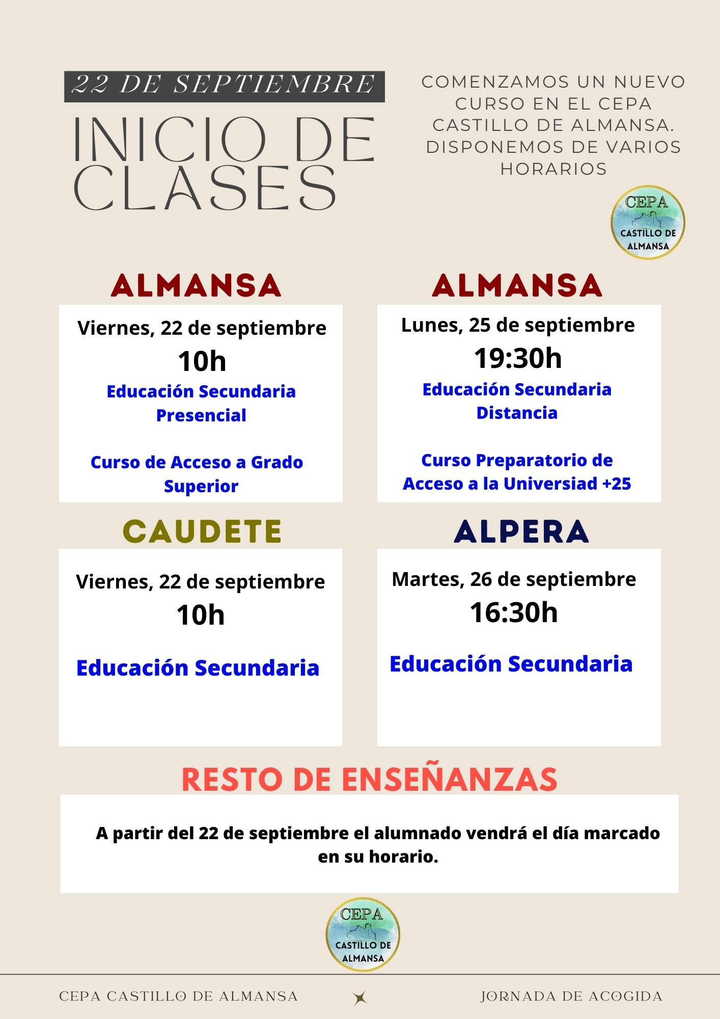 El CEPA CASTILLO DE ALMANSA iniciará sus clases el próximo 22 de septiembre, hemos definido distintos horarios de comienzo de curso, debéis tener en cuenta: