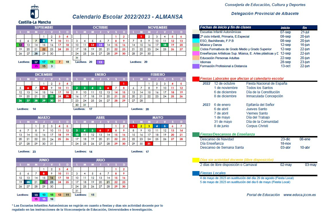 CALENDARIO ESCOLAR PARA ALMANSA y CAUDETE - CURSO 2022/23
