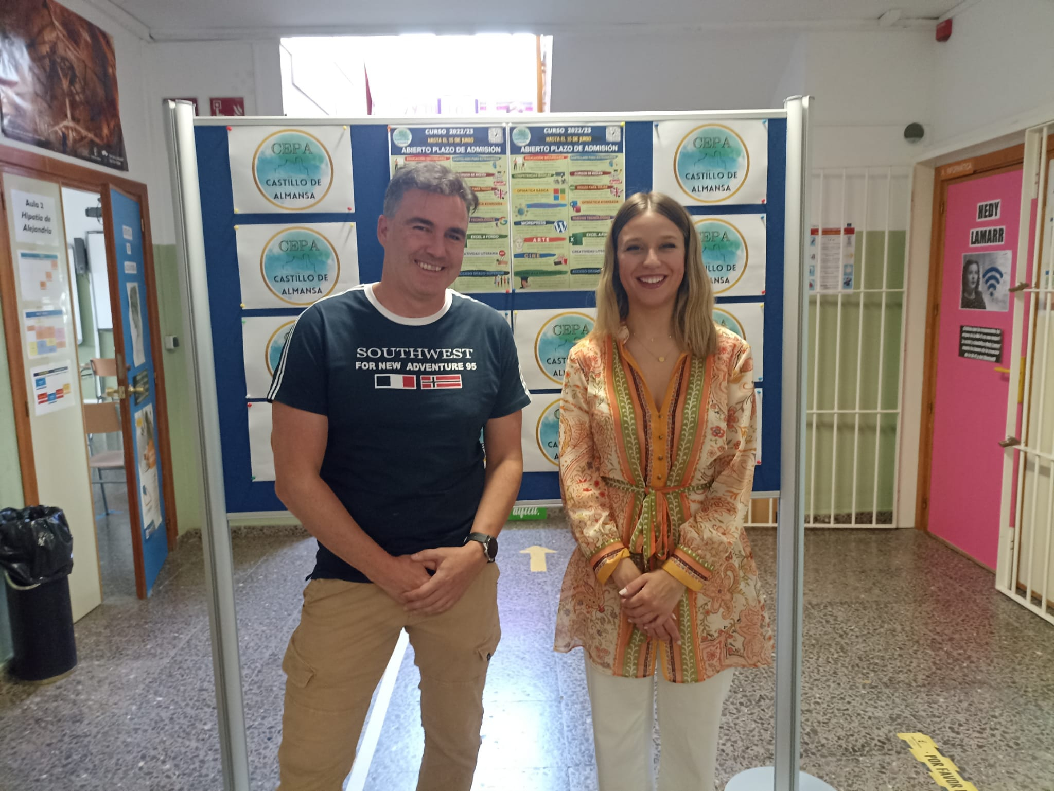 Marta Rico ha dado una rueda de prensa en el hall del CEPA CASTILLO DE ALMANSA para informar del periodo de admisión y de todas las enseñanzas ofertadas, junto con el Secretario, ha remarcado la importancia que tiene en la sociedad los centros de adultos y cómo la formación es el camino hacia la recuperación.