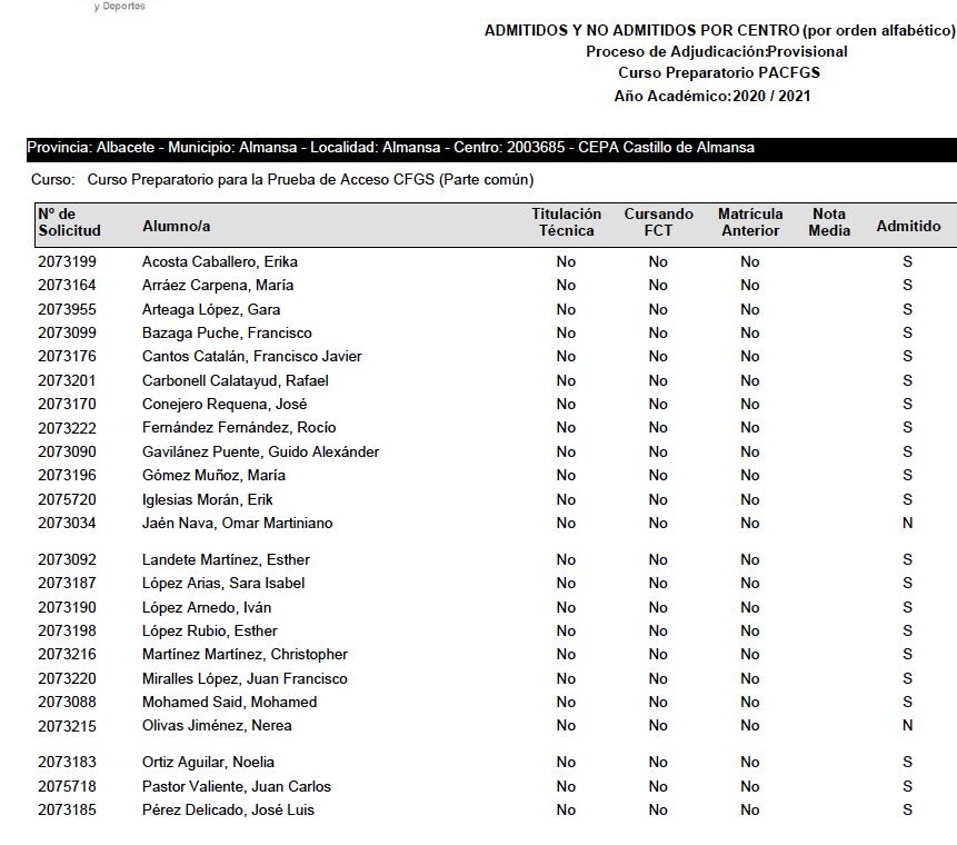 Curso Preparatorio para la prueba de Acceso a Grado Superior. LISTADO PROVISIONAL DE ADMITIDOS Y EXCLUIDOS.