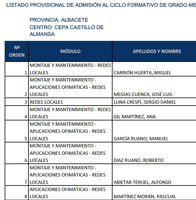 CICLO FORMATIVO "SISTEMAS MICROINFORMÁTICOS Y REDES". LISTADO PROVISIONAL DE ADMITIDOS