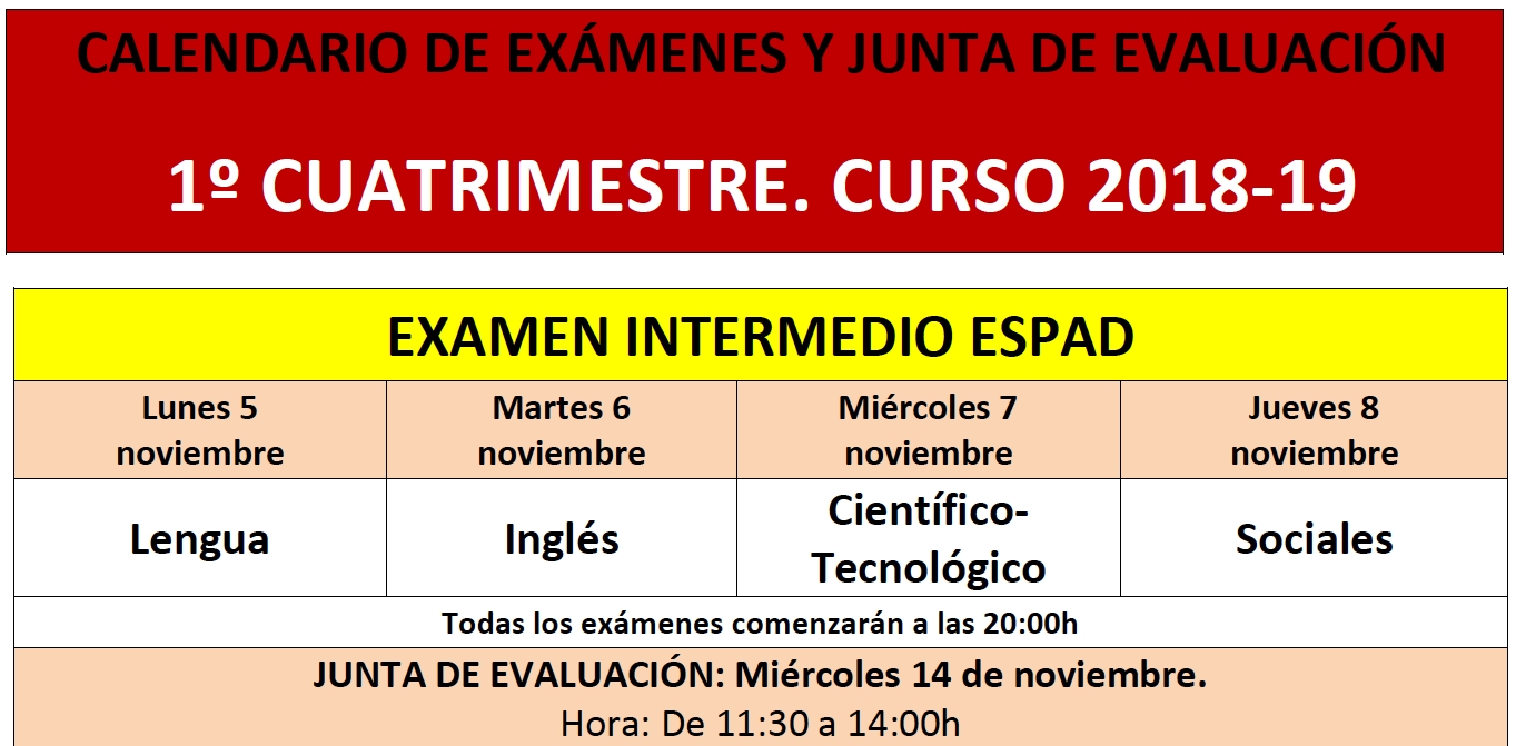 Ya están publicadas las fechas de los exámenes ordinarios y extraordinarios del 1º cuatrimestre de los alumnos de ESPAD de ALMANSA. Alumnos que vienen en el horario de tarde.