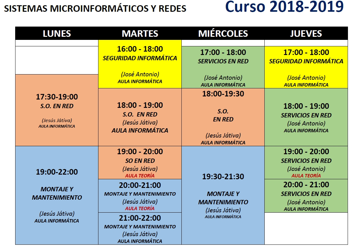 Os adjuntamos el horario del Ciclo Formativo de Grado Medio "Sistemas Microinformáticos y Redes".