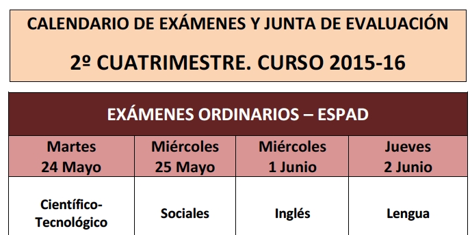 Calendario de exámenes ordinarios y extraordinarios del 2º Cuatrimestre de ESPA/ESPAD