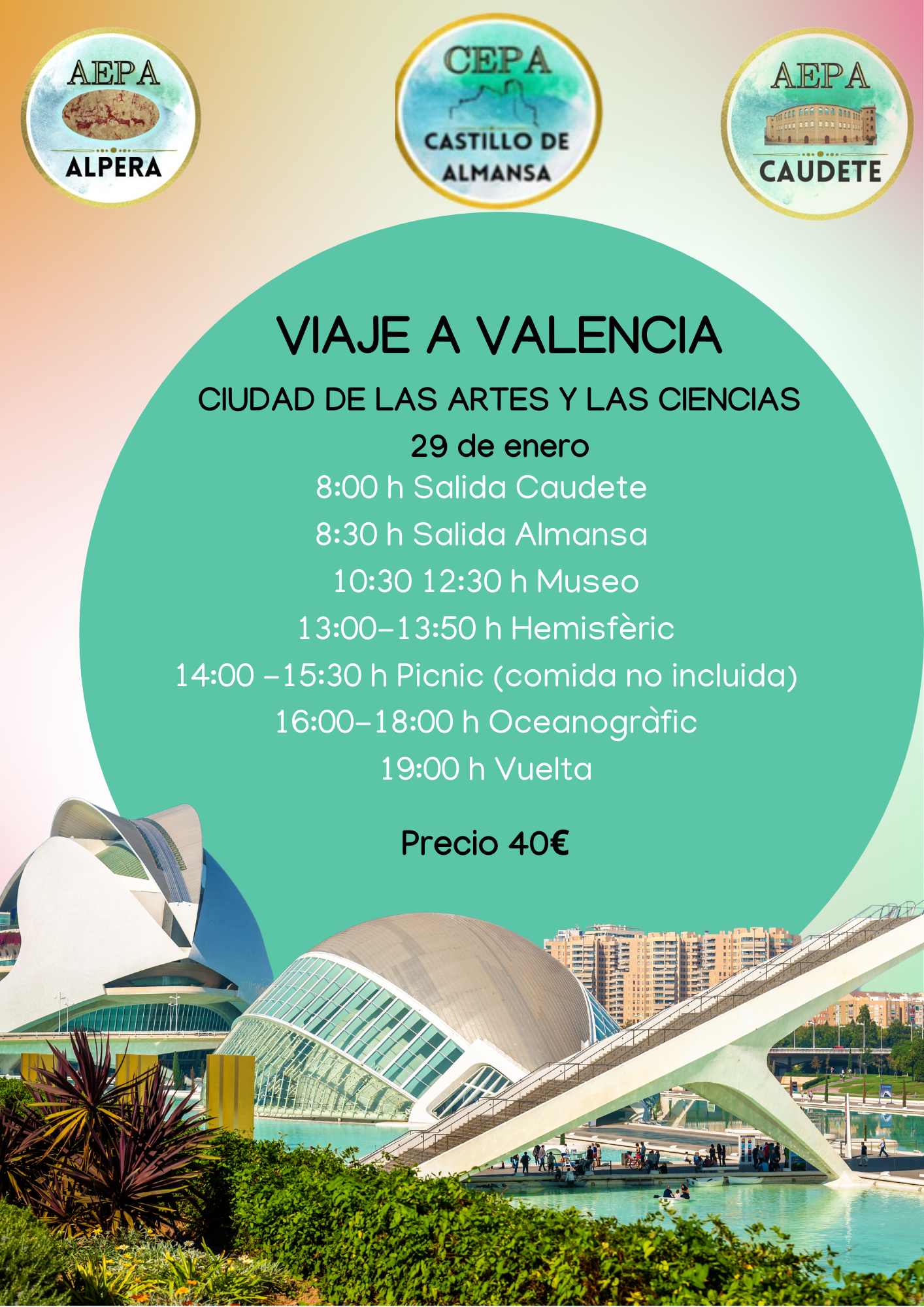 Viaje organizado por el departamento Científico/tecnológico a la Ciudad de las Artes de Valencia. Una oportunidad única de visitar un complejo espectacular de ciencia y tecnología. El precio es de sólo 40€ gracias a la subvención que aporta el centro. NO TE LO PIENSES MUCHO QUE TE QUEDAS SIN PLAZA.