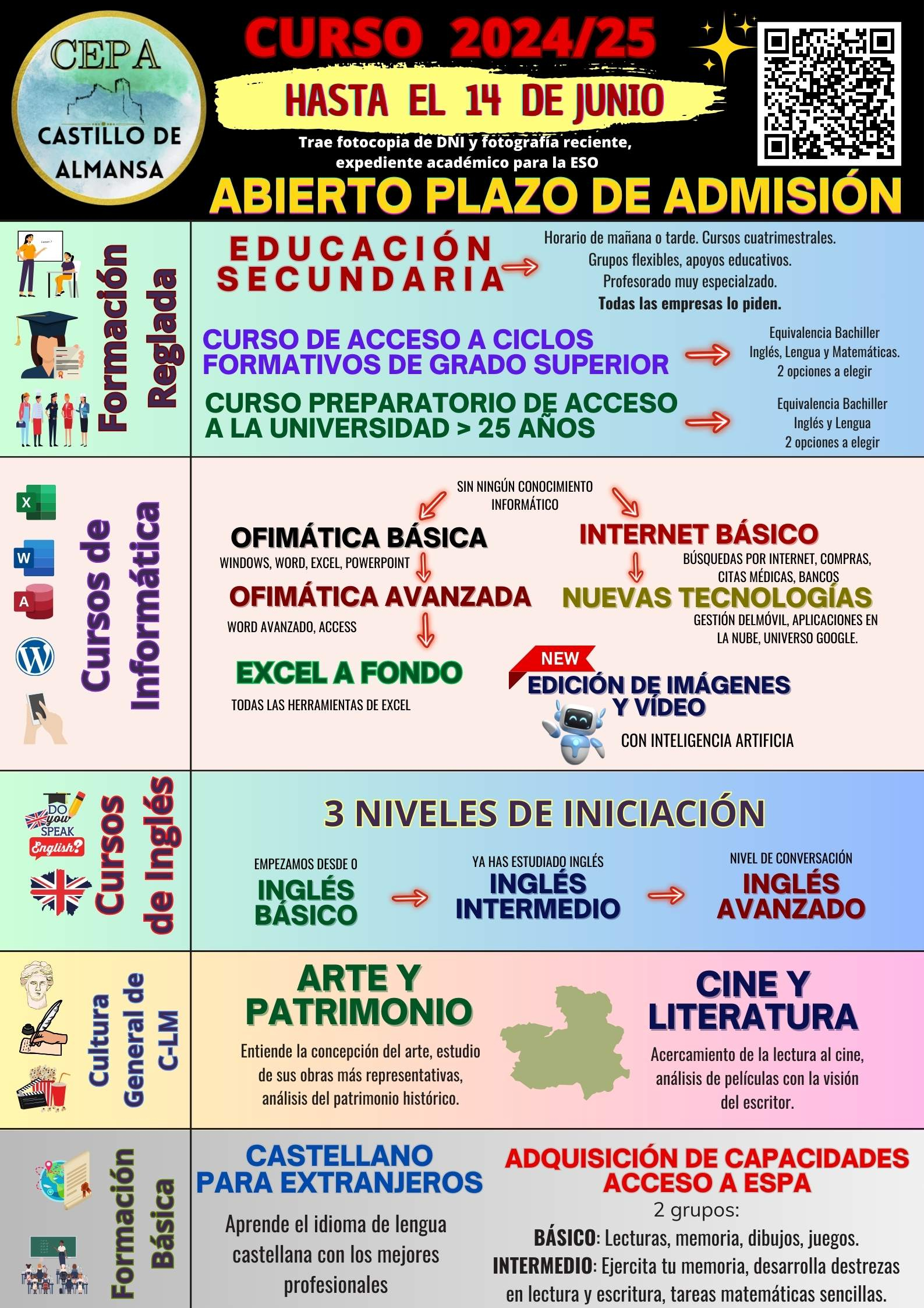 Abierto Plazo de Admisión en enseñanzas para PERSONAS ADULTAS, curso 2024/25. Hasta el 18 de septiembre. ALMANSA, CAUDETE Y ALPERA.